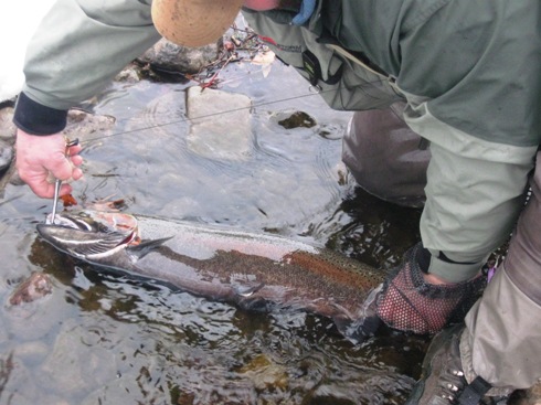 Three years ago I met two big dudes, Joe & Chris Grenon. I said these guys love fishing almost as much as I did. I was dead wrong. They may love it more. Here are some shots of two brothers who just started Steelhead fishing last year. I love fishing with Joe and Chris. Last November 16 of us went Steelhead fishing including Joe and Chris. These guys fit in where ever we go. Congrats on another successful trip. Pink San Juan Worms, Black Orange/Pink Fleas & Chartreuse Caddis Pupa seemed to be the ticket. "Is one more trip in the cards" I am living vicariously through these two guys right now...